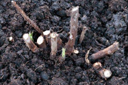 - Die Stecklinge werden sofort horizontal in ein vorbereitetes Beet mit lockerem, fruchtbarem Boden gepflanzt und mit einer 5-10 cm dicken Schicht Bio-Mulch bedeckt.
