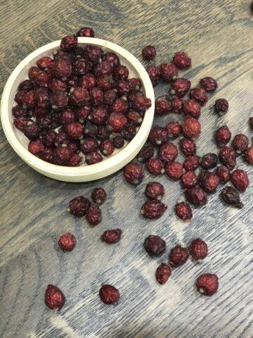 - Getrocknete Hagebutten abspülen und mit Papiertüchern trocken tupfen. Wenn die Rohstoffe zuvor von Hand gesammelt und gereinigt wurden, kann dieser Schritt übersprungen werden.