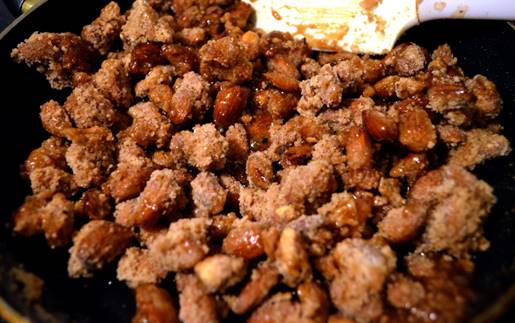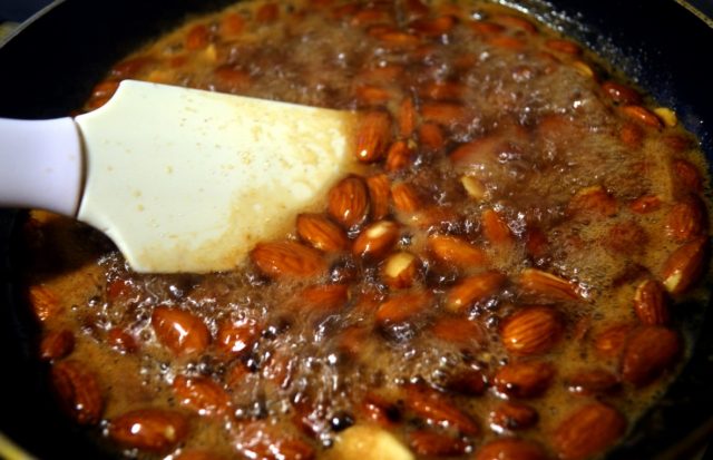 - Sobald der Zucker den gewünschten Farbton erreicht hat, können Sie die Erdnüsse sofort unter ständigem Rühren hineingießen. Es ist wichtig, die Konsistenz des Karamells zu überwachen. Wenn alle Bohnen mit Zuckerkristallen bedeckt sind, können Sie die Hitze abstellen. Sie müssen die Bohnen sofort in einen anderen Behälter umfüllen, damit sie abkühlen und das Karamell fest wird.
