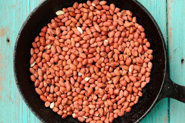 - Ungeschälte Erdnüsse müssen 3-5 Minuten bei schwacher Hitze in einer Pfanne gebraten werden. Die Bohnen sollten sich erwärmen und einen angenehmen herben Geschmack abgeben.