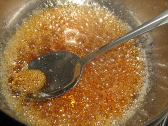 - Mischen Sie Zucker und Wasser in einem separaten Behälter. Es ist wünschenswert, dass sich die Kristalle allmählich aufzulösen beginnen. Diese Mischung sollte in eine saubere heiße Pfanne gegossen und 5 Minuten lang erhitzt werden. Der Zucker sollte einen hellbraunen Farbton annehmen.