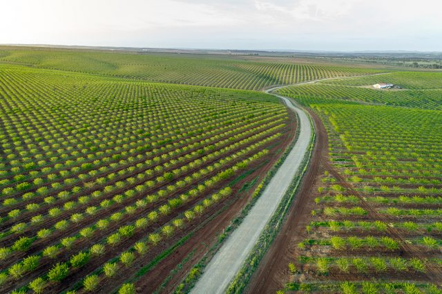 Auf der kalifornischen Plantage aus der Vogelperspektive können Sie sehen, dass die Bäume frei wachsen und zwischen ihren Kronen eine erhebliche Lücke verbleibt. Dies ist der einzige Weg, um eine substanzielle Ernte zu erzielen.