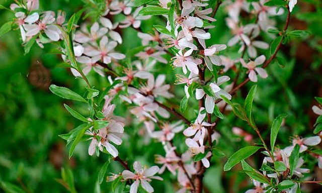 Sie erscheinen selten im März oder April - bis Ende Februar, bevor sich die Blätter öffnen. Große Blüten, in Mandel - blassrosa, mit fünf Blütenblättern, symmetrisch, einzeln, bis zu 2,5 cm Durchmesser. Der Kelch ist glockenförmig, die Staubblätter sind von 15 bis 30, der Stempel ist einer.