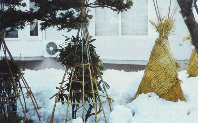 - Der Strauch wird sofort an die Stütze gebunden, so dass sich der Wurzelkragen 5-7 cm über die Bodenoberfläche erhebt.