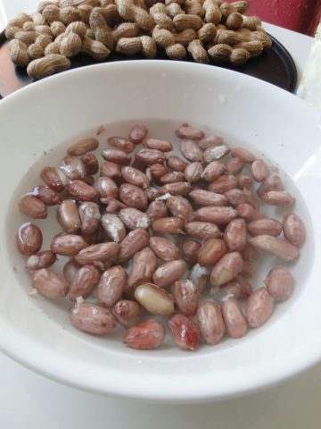 - Das Wasser wird abgelassen und die gequollenen Schalen von den Erdnüssen entfernt.