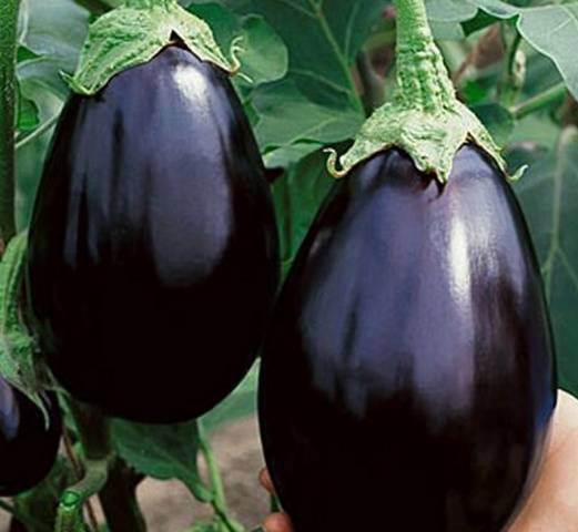 Die ersten birnenförmigen Früchte der Black Beauty Auberginen reifen 3,5 Monate nach der Keimung. Die Pflanze ist verzweigt, kräftig, 45–60 cm hoch. Die Früchte werden mit einem Gewicht von 200–300 g geerntet. Die Früchte werden so lange fortgesetzt, bis die Tagestemperatur unter einem Film oder in einem Gewächshaus auf 15 Grad abfällt. Schätzen Sie die Größe der Früchte auf dem Foto im Vergleich zur Palme.