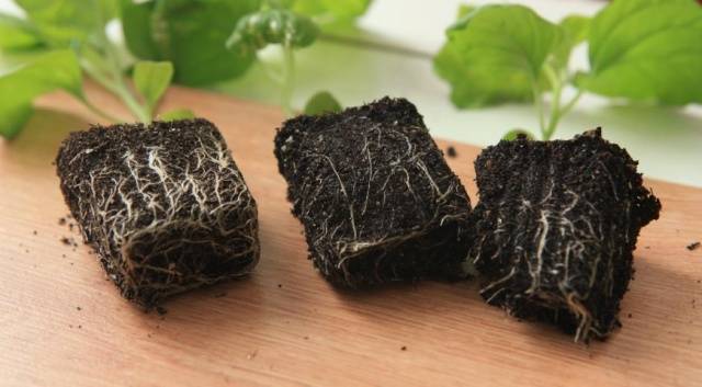 Auberginenwurzeln sind zart, Schäden beim Lösen des Bodens werden langsam wiederhergestellt, was sich negativ auf die Entwicklung der Pflanze und die Fruchtbildung auswirkt. Die Kultur toleriert Transplantationen schmerzhaft. Bei der Keimlingsmethode ist es ratsam, Pflanzen in Torftöpfen oder Tabletten mit großem Durchmesser zu züchten, so dass sich der Großteil der Wurzeln in einem Erdklumpen befindet.