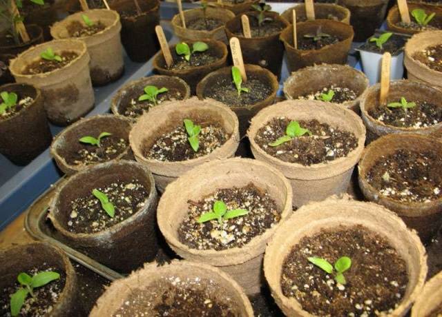 Um die Wurzeln beim Pflücken und Wiederbepflanzen an einem dauerhaften Ort nicht zu beschädigen, werden die Samen der Black Beauty-Auberginen in Torftöpfe (wie auf dem Foto) oder Torftabletten maximaler Größe gepflanzt. Nichts sollte das Wurzelwachstum einschränken. Und sie müssen frei atmen. Die Samenkeimung erfolgt bei einer Temperatur von 25 bis 30 Grad und das Wachstum der Sämlinge bei 20 bis 25 Grad. Die Nachttemperatur beträgt nicht weniger als 16-18 Grad.