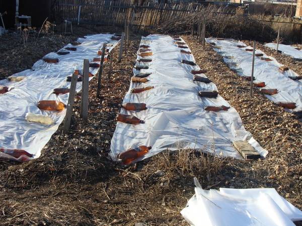 Das Wetter im Norden ist heimtückisch, nach dem Auflaufen der Sämlinge sind Fröste möglich. Decken Sie die Bepflanzung mit Lutrastil oder Agrofaser ab. Wenn Sie genug davon haben, setzen Sie die Spitzen in die Rille und bestreuen Sie sie mit Erde von den Graten. Wenn der Frost vorbei ist und die Sonne herausschaut, wird sie sich strecken.