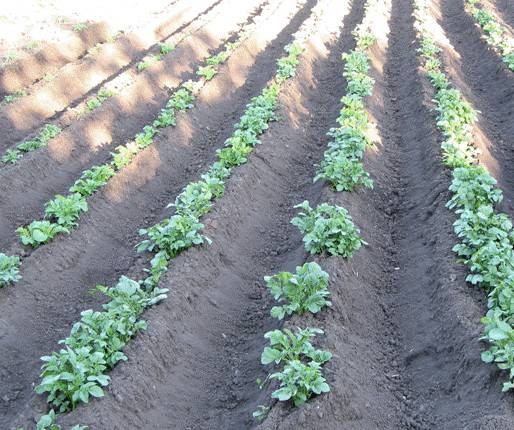 Der verbleibende Boden von den Kämmen wird verwendet, wenn sich der Boden zum Hillen von Kartoffeln erwärmt. Das Hilling muss mehr als beim konventionellen Anbau erfolgen, da die Kartoffeln keimen. Am Ende der Saison bewegt sich der gesamte Grat zu den Kartoffeln.