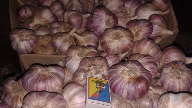 Knoblauch wird im 1. oder 2. Juli-Jahrzehnt geerntet. Die Köpfe werden vorsichtig hineingegossen, 1-2 Stunden trocknen gelassen und von Erde gereinigt. Unter einem Baldachin werden die Zwiebeln 1-2 Wochen lang getrocknet, dann werden die Stängel geschnitten und in Aufbewahrungsboxen im Keller ausgelegt.
