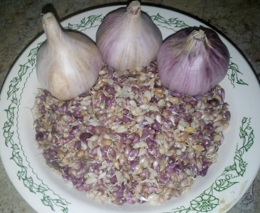 Die ständige Vermehrung von Knoblauch durch Gewürznelken von großen Köpfen führt von Jahr zu Jahr zur Degeneration der Art. Daher müssen diejenigen Gärtner, die es ernst meinen, am Boden zu arbeiten, ein paar Pfeile mit Samen für die weitere Fortpflanzung hinterlassen.