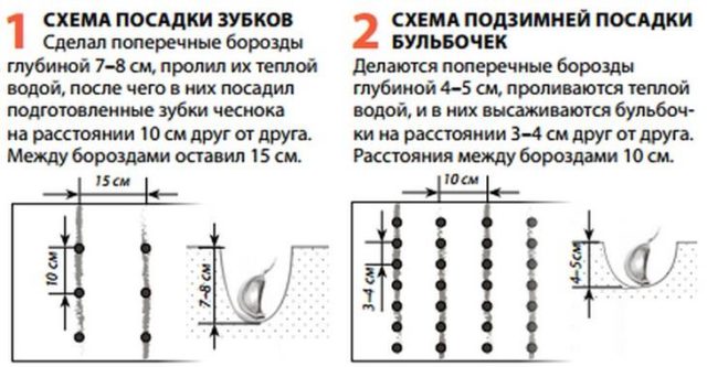 Pflanzmaterial von Winterknoblauch wird nur im Herbst gepflanzt. Der einzige Unterschied besteht in der Tiefe des Pflanzens von Läppchen und Zwiebeln. Letztere werden bis zu einer Tiefe von 5 cm ausgesät. Vor dem Pflanzen werden alle Samen desinfiziert.