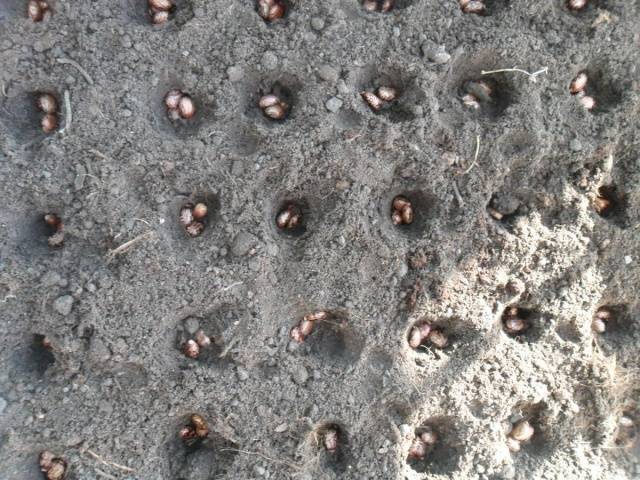 Der Rost wird über die gesamte Oberfläche des Bettes in den Boden gedrückt, wonach sich gleichmäßige Löcher bilden. In jeden von ihnen müssen zwei oder drei Samen gelegt werden.