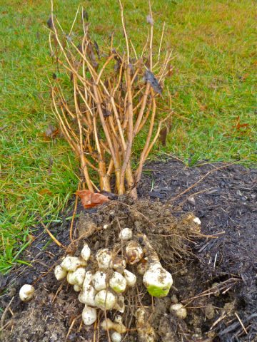 Wenn die Pflanzung in flachem Gelände durchgeführt wurde, werden die Verfahren zur Lockerung des Bodens durch das Hillen einer jungen Pflanze ergänzt. Es ist nach oben mit Erde bedeckt. Bei 50% der jungen Triebe ist es möglich, bis zum Frühjahr zu überleben. Die gefrorenen Sprossen werden schnell wiederhergestellt. Die Hauptaufgabe bei der Pflege von Herbstpflanzen ist die Erhaltung der Knollen.