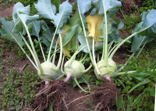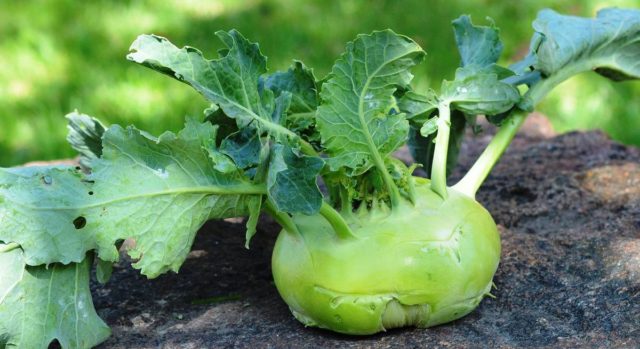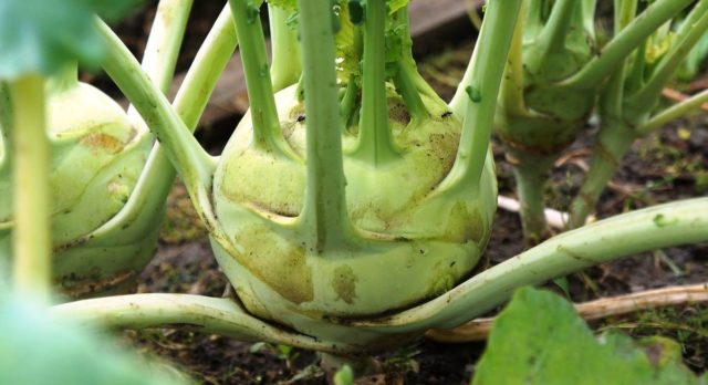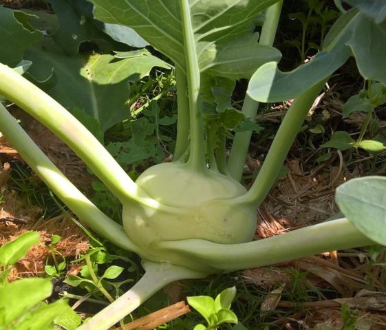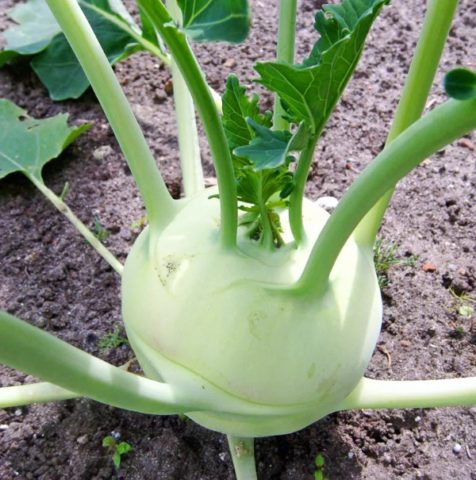 Das Standardgewicht des Stiels liegt im Bereich von 0,3 bis 0,5 kg, bei einigen Sorten kann diese Zahl jedoch um ein Vielfaches höher sein. Der Geschmack von Kohlrabi-Fruchtfleisch ähnelt stark einem gewöhnlichen Kohlstumpf, ist jedoch weicher und harmonischer, hat jedoch nicht die Härte, die Weißkohlarten innewohnen. Im Zusammenhang mit der Stängelernte hat sie eine weiße oder leicht grünliche Farbe. Kohlrabi-Kohl hat auch Blätter, sie sind wenige, eiförmig oder dreieckig, mit stark verlängerten Blattstielen. Im Gegensatz zu gewöhnlichem Kohl werden sie normalerweise nicht für Lebensmittel verwendet.