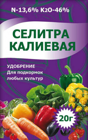 Kaliumnitrat kann unter einem anderen Namen gefunden werden - Kaliumnitrat. Der Dünger enthält 3 Komponenten gleichzeitig: Stickstoff- (14%), Kalium (46%) und Phosphor (7%). Eine solch komplexe Zusammensetzung ermöglicht es Ihnen, Tomaten nicht nur mit Kalium, sondern auch mit Stickstoff zu füttern, um das Wachstum zu aktivieren. Es ist sinnvoll, während der Zeit der Eierstockbildung Dünger zu verwenden.