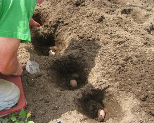 Ein wenig mit Humus vermischter Torf wird in die ca. 10 cm tiefen Löcher gegeben. Der Reihenabstand ist 65-70 cm breit und in einer Reihe wird ein Abstand von 25-30 cm zwischen den Gruben eingehalten.