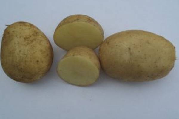 Massive ovale Knollen pro Saison nehmen durchschnittlich 110-150 g zu. Die Haut der Kartoffeln ist gelb, kleine Augen bleiben auf den Knollen. Hellgelbes Fruchtfleisch (Foto). Der Stärkeindikator entspricht Tabellensorten - 13-16%. Die Reifezeit der Ernte beträgt 70-85 Tage. Die Kartoffelsorte Arizona eignet sich hervorragend für die Lagerung im Winter (95% Qualität).