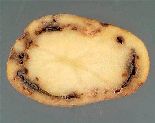 Es manifestiert sich durch das Auftreten dunkelgrauer Flecken auf den Blättern und Stielen. Die Krankheit betrifft die gesamte Pflanze bis hin zu den Knollen. Sie fangen an zu faulen.