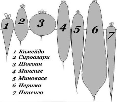 - Kameida - kurze konische Wurzelfrüchte bis 15 cm, die zu zwei Dritteln ihrer Größe in leichten Boden eingetaucht sind;