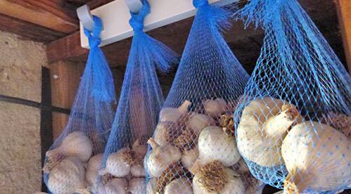 - Für diejenigen, die große Mengen Knoblauch anbauen, ist es bequemer, die Ernte in speziellen Netzen für Gemüse zu lagern. Sie können auch unnötige Nylonstrumpfhosen verwenden. Sie können entweder drinnen ausgelegt oder an die Wände gehängt werden.
