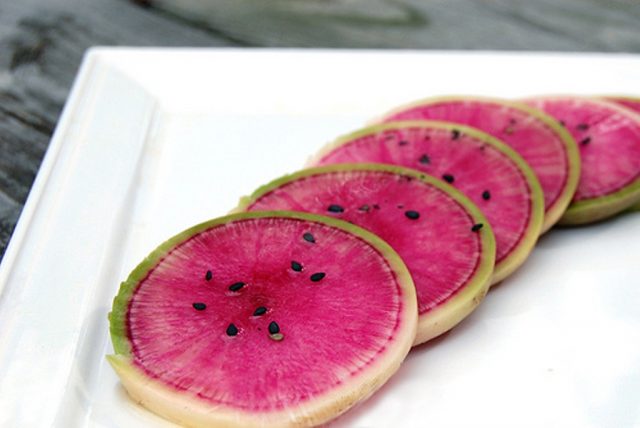 Wassermelonenrettich ist eine pflanzliche Hybride mit hellrosa, saftigem Fruchtfleisch. Dieses spezielle Wurzelgemüse kombiniert schönes Fleisch, süßen Geschmack und pikante Bitterkeit. Für russische Gärtner ist die Pflanze ungewohnt, aber unprätentiöser, rosa Rettich wird in verschiedenen Ländern häufig zum Kochen verwendet, und in Kalifornien gilt sie als Hit.