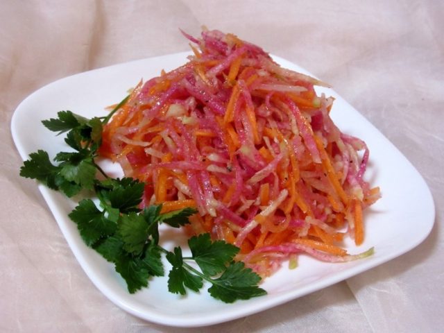 Rotrettichsorten können gebacken, gebraten und gedünstet werden. Das geschälte Fruchtfleisch ist ideal für die Zubereitung von Salaten, die Dekoration von Cocktails und Desserts. Den Gerichten wird nicht nur rosa Fruchtfleisch hinzugefügt, sondern auch der grüne Teil.