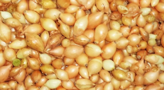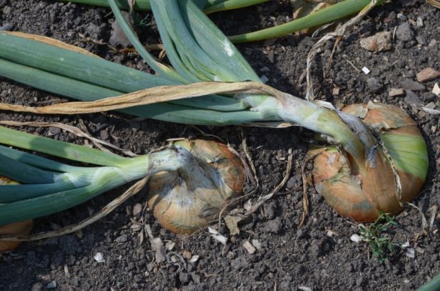 Wenn der Hals austrocknet und sich schließt, werden die Zwiebeln mit einer Heugabel ausgegraben und die Federn abgeschnitten. Die Köpfe werden 4-5 Tage getrocknet und dann in Behälter mit losen Wänden gegeben. An einem kühlen und trockenen Platz aufbewahren.