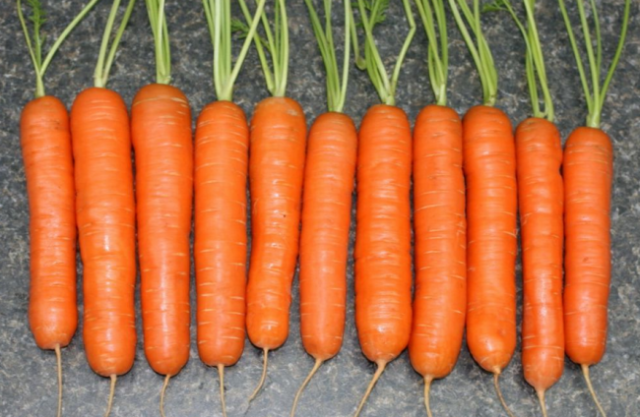 Diese Karottensorte ist Gärtnern bekannt und gilt als eine der besten. Die Produktivität ist hoch, konische Wurzelfrüchte mit einem stumpfen Ende. Ihre Größe reicht von mittel bis groß (500 Gramm), abhängig von den Wachstumsbedingungen.