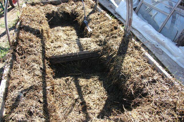 - Die Rillen mit Heu oder Stroh (30 cm) bedecken, mit Mist (20 cm) bedecken, mit Dolomitmehl bestreuen, stopfen, mit Erde begraben.