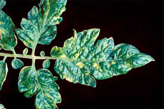Tomaten sind anfällig für das Tabakmosaikvirus, das den Prozess der Photosynthese in den Blättern stört. Die Krankheit kann durch eine Reihe von Anzeichen bestimmt werden: