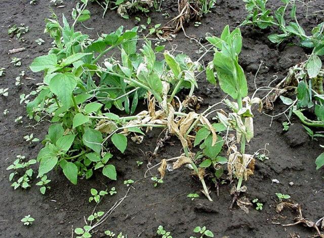 - Fusarium. Die Krankheit wird durch Bodenpilze verursacht, die das Wurzelsystem von Ambrosia-Erbsen infizieren. Pflanzen verdorren stark, sie können nicht mehr behandelt werden.
