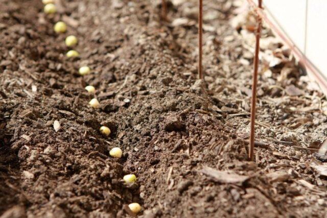 - Die vorbereiteten Ambrosia-Erbsensamen in einem Abstand von 10-15 cm verteilen.