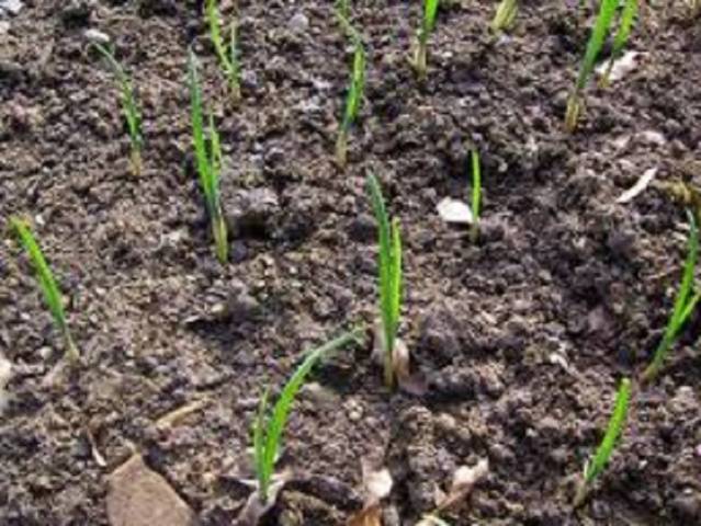 Am Ende des Sommers werden Mineraldünger mit organischer Substanz ausgebracht. Es ist besser, dies in der zweiten Augusthälfte zu tun. Die Menge der Nährstoffkomponenten unterscheidet sich nicht von den oben genannten. Sie graben ein Bett aus und verschütten es mit Wasser, um den Boden schnell zu schrumpfen. Bei dieser Methode wird kein Kupfersulfat verwendet. Nach der Besiedlung des Landes werden die Samen in Reihen parallel zu den vorgesehenen Knoblauchreihen ausgesät. Der Abstand der Reihen wird auf 30-40 cm gehalten. Wenn der Knoblauch gepflanzt wird, sprießen bereits grüne Sprossen in den Beeten, zwischen denen Knoblauchzehen gepflanzt werden. Diese Technologie schützt die Knoblauchbeete zu Beginn des Winters vor Schnee.