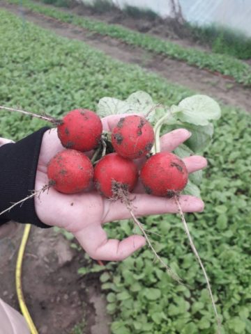 Die reife Ernte im Gewächshaus wird das ganze Jahr über geerntet.Der Boden im Gewächshaus ist mit mineralischen und organischen Düngemitteln angereichert. Wenn Radieschen in einem Gewächshaus in reichhaltigen Bodenmischungen ausgesät werden, reicht es aus, während des Auftretens der ersten Blätter mit Asche zu bestäuben.