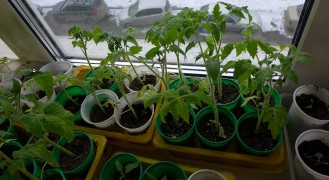Behälter oder Tassen mit Tomatensamen werden mit Folie oder einem luftdichten Deckel abgedeckt und zum Keimen an einen warmen Ort gestellt. Wenn die ersten Triebe erscheinen, wird der Deckel entfernt - dies sollte schrittweise erfolgen. Tomaten werden an einen kühleren und helleren Ort gebracht (eine Fensterbank auf der Südseite ist perfekt).