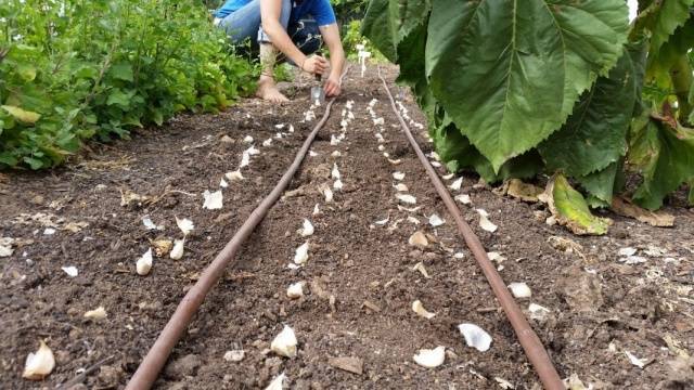 Wenn sich die Erde nach dem Graben (nach ein paar Wochen) gesetzt hat, können Sie Rillen machen und Schnittlauch pflanzen. Wenn Sie nicht warten und den Knoblauch sofort in die ausgegrabene Erde pflanzen, fallen die Nelken zu tief, was das Wachstum der Pflanze im Frühjahr hemmt.