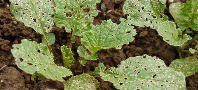 Kohlfloh | Blätter junger Pflanzen in Löchern. Sämlinge können sterben | Mit Holzasche und gemahlenem Pfeffer bestäuben. Die neueste Volkserfindung: Besprühen mit Bim-Shampoo, das zur Bekämpfung von Flöhen bei Hunden entwickelt wurde (50-60 ml pro 10 Liter Wasser) |