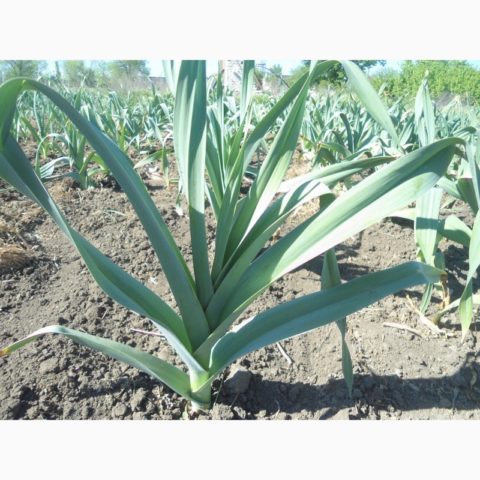Im Garten zeichnet sich eine erwachsene Pflanze mit einer Höhe von 50-80 cm durch ihre Größe aus. Auf einem dicken Rocumboll-Stiel sind 6-9 Blätter 30-60 cm lang, 3-6 cm breit, ähnlich den linearen Lauchfedern. Eine flache Blattspreite mit Längsstreifen schärft sich zur Spitze hin, ist leicht mit einer wachsartigen Beschichtung bedeckt, fühlt sich rau an und hat eine hellgrüne Farbe. In der Mitte des Blattes befindet sich eine leichte Falte.