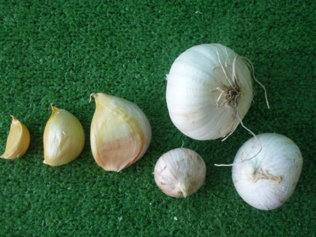In einem 2 Jahre alten Knoblauch bilden sich am Boden Stolonen mit 10-15 Babyzwiebeln mit einem Gewicht von 1,5-4 g, mit einer starken Schale von dunklerer, gelbbrauner Farbe im Vergleich zum weißen Farbton eines großen Kopf. Wenn die Stolonen kurz werden, haften die Babys eng an den Zähnen und verstecken sich hinter der Schale der Mutter.