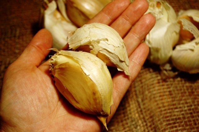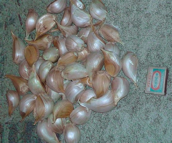 Zu Beginn der nächsten warmen Jahreszeit gepflanzt, bilden einzahnige Nelken nach 110 Tagen einen großen Rocambol-Knoblauch, wie auf dem Foto, mit mehreren saftigen Nelken von 3 bis 5-6. Die Größe des Gemüses hängt von ausreichender Wärme und Nährstoffen im Boden ab. Der Durchmesser der Knoblauchzehen beträgt 6 bis 10 cm, das Gewicht 100-500 g. Eine Gewürznelke kann 15 cm lang sein. m 3 kg sammeln.Neue Kinder erscheinen in der Nähe der Zähne. Jeder, der Rocambol probiert hat, bemerkt die Ähnlichkeit des Geschmacks mit Zwiebeln und Knoblauch gleichzeitig.
