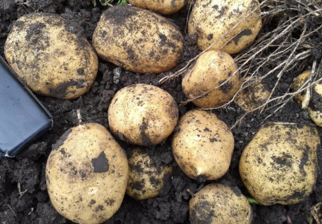- Die durchschnittliche Masse der marktfähigen Knollen beträgt 90-120 Gramm (große Kartoffeln).