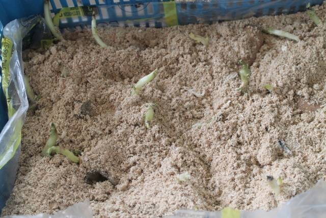 Etwa zwei Wochen vor dem Pflanzen werden die Pflanzkartoffeln an einen warmen Ort gebracht und in einer Schicht in Holzkisten ausgelegt. Es ist ratsam, die Knollen mit frischem Sägemehl zu bestreuen und das Sägemehl täglich mit Wasser zu besprühen. In einer feuchten und warmen Umgebung keimen Zorachka-Kartoffeln schneller.