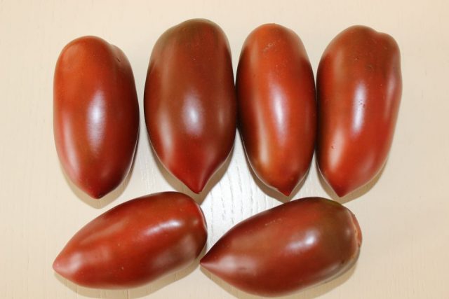 Unbestimmte Pflanzenarten. Die Fruchtreifezeit ist durchschnittlich. Auf freiem Feld wächst der Busch bis zu 1,3 m, im Gewächshaus bis zu 1,5 m. Halbverbreitete Triebe. Der Pinsel ist einfach. Darauf bilden sich 5-10 Tomaten. Fruchtgewicht 90-120 g. Die Farbe ist dunkelbraun. Die Farbe des Fruchtfleisches ist burgunderrot, der Geschmack ist zart, süß. Sie werden zum Salzen und zum Frischverzehr verwendet.