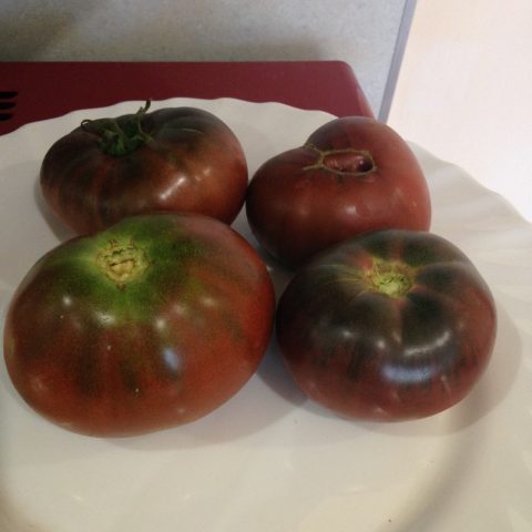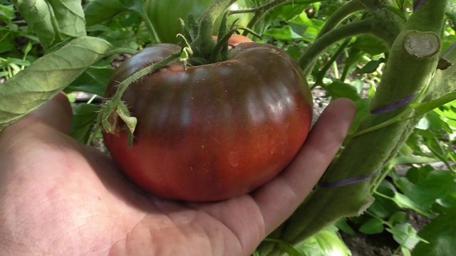 Halbdeterminante schwarzfruchtige Tomate. Eine seltene fruchtbare Sorte. In Zentralrussland werden sie unter dem Film gepflanzt. Die Höhe des Busches im Gewächshaus beträgt bis zu 1,7 m, auf dem Gartenbett ist niedriger. Blätter des üblichen Typs. Bilden Sie 2-3 Stängel der Pflanze für maximalen Ertrag.