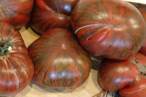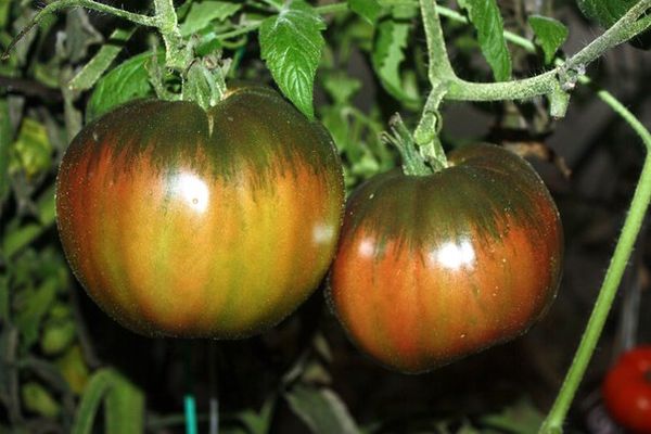 - Die Früchte haben eine runde Form und sind um den Stiel gerippt. Der Farbton von Tomaten ist Schokolade oder Kastanienbraun.