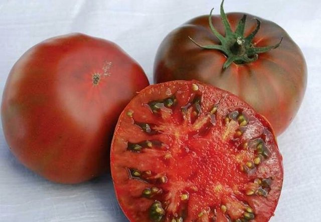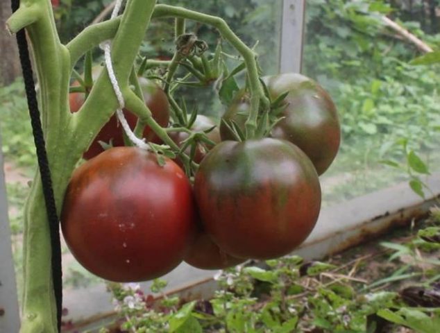Empfohlen für Gartenbetten und Gewächshäuser. Die Pflanze ist groß und wird bis zu 2 m hoch.Die Fruchtreifezeit beträgt 120 Tage. Das Gewicht einer Tomate beträgt 120–150 g. Die Form ist rund. Farbe kastanienbraun und dunkelbraun: