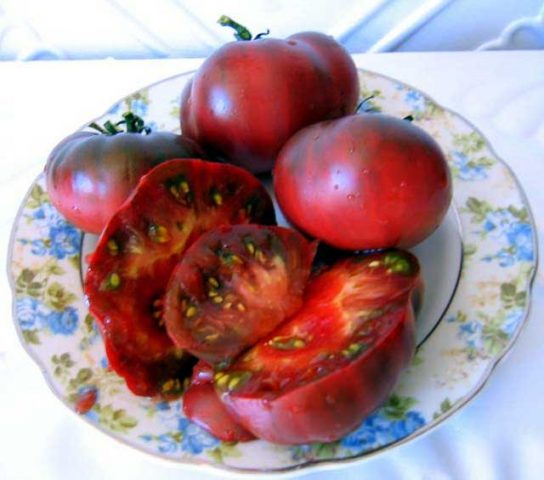 Das durchschnittliche Gewicht der schwarzen Tomate beträgt 100 g. Das Herz ist fleischig, saftig, lecker. Das Gemüse wird meist frisch gegessen. Das reiche Aroma von Tomaten ist zu spüren.