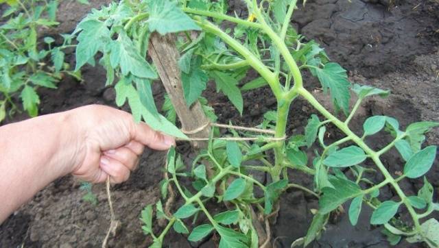 Weitere Pflege besteht in der regelmäßigen Bewässerung, Entfernung von Stiefkindern. Übertreibe es nicht mit Gießen. Andernfalls erhalten Sie wässrige Tomaten, die nicht gut schmecken und knacken. Alle 5 Tage gießen. Das Entfernen von Stiefkindern ist der wichtigste Prozess für Gärtner. Entfernen Sie am besten Seitentriebe, die nicht größer als 5 cm geworden sind. Binden Sie die Sämlinge nach 14 Tagen zusammen.
